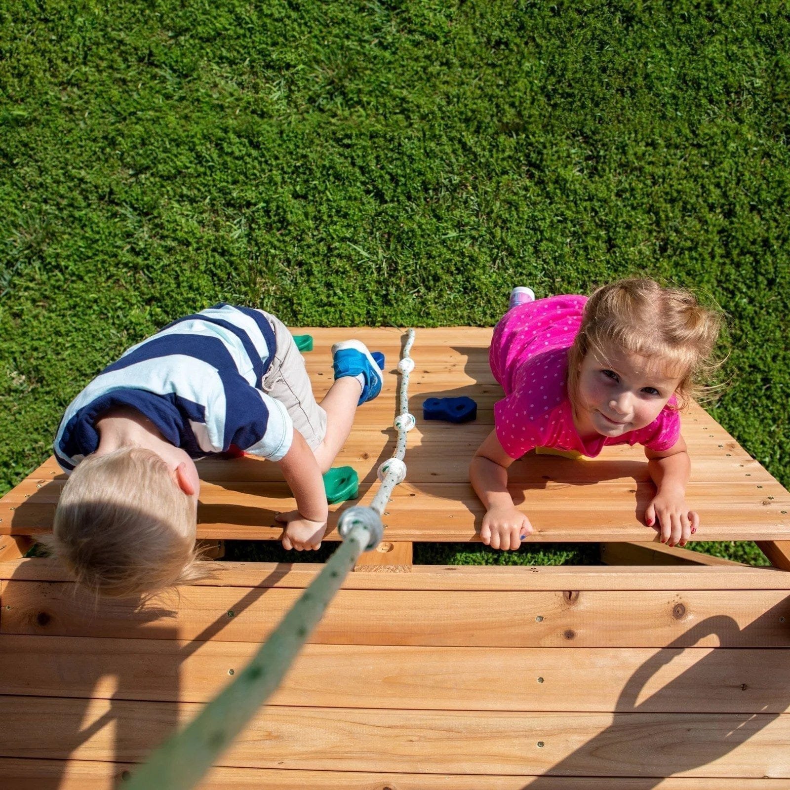 - Full width, double rock wall with climbing rope offers a much larger climbing structure that can allow 1 or 2 children to use at the same time.
