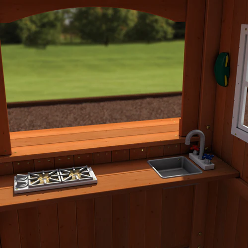 Lower Playhouse: Includes a play kitchen with a toy stovetop, sink, cordless phone, and a full front door to create a cozy charming mountain home