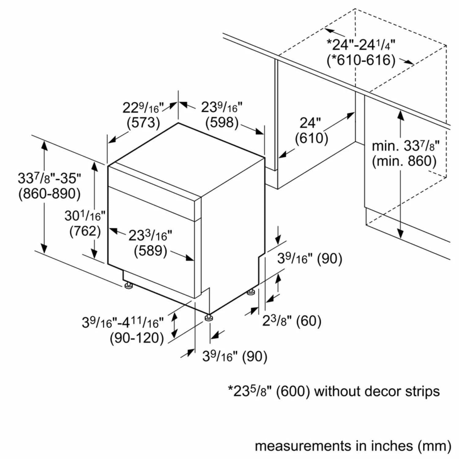 Cut-Out Depth (in.) 24 in Cut-Out Height (in.) 33.88 in Cut-Out Width (in.) 24 in Depth – Door Shut (with Handle) (in.) 23.75 in Depth – Door Shut (without Handle) (in.) 23.75 in Depth With Door Open 90 Degrees (In) 47.5 in Dishwasher Size 24 In. Height – Maximum (in) 35 in Height – Minimum (in) 33.88 in Product Depth (in.) 23.75 in Product Height (in.) 33.87 in Product Width (in.) 23.56 in Details