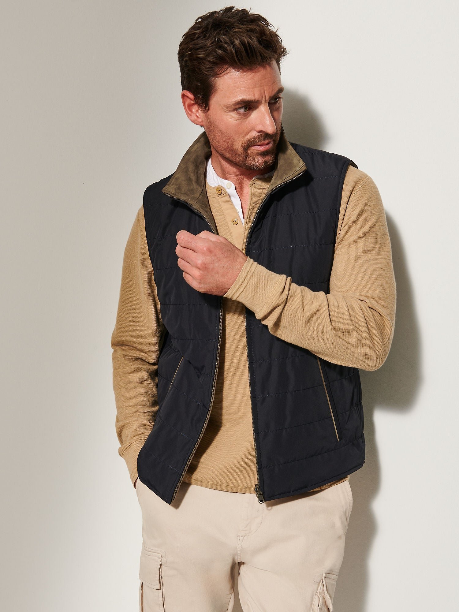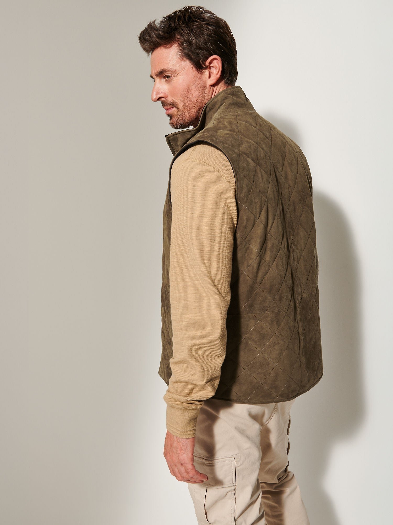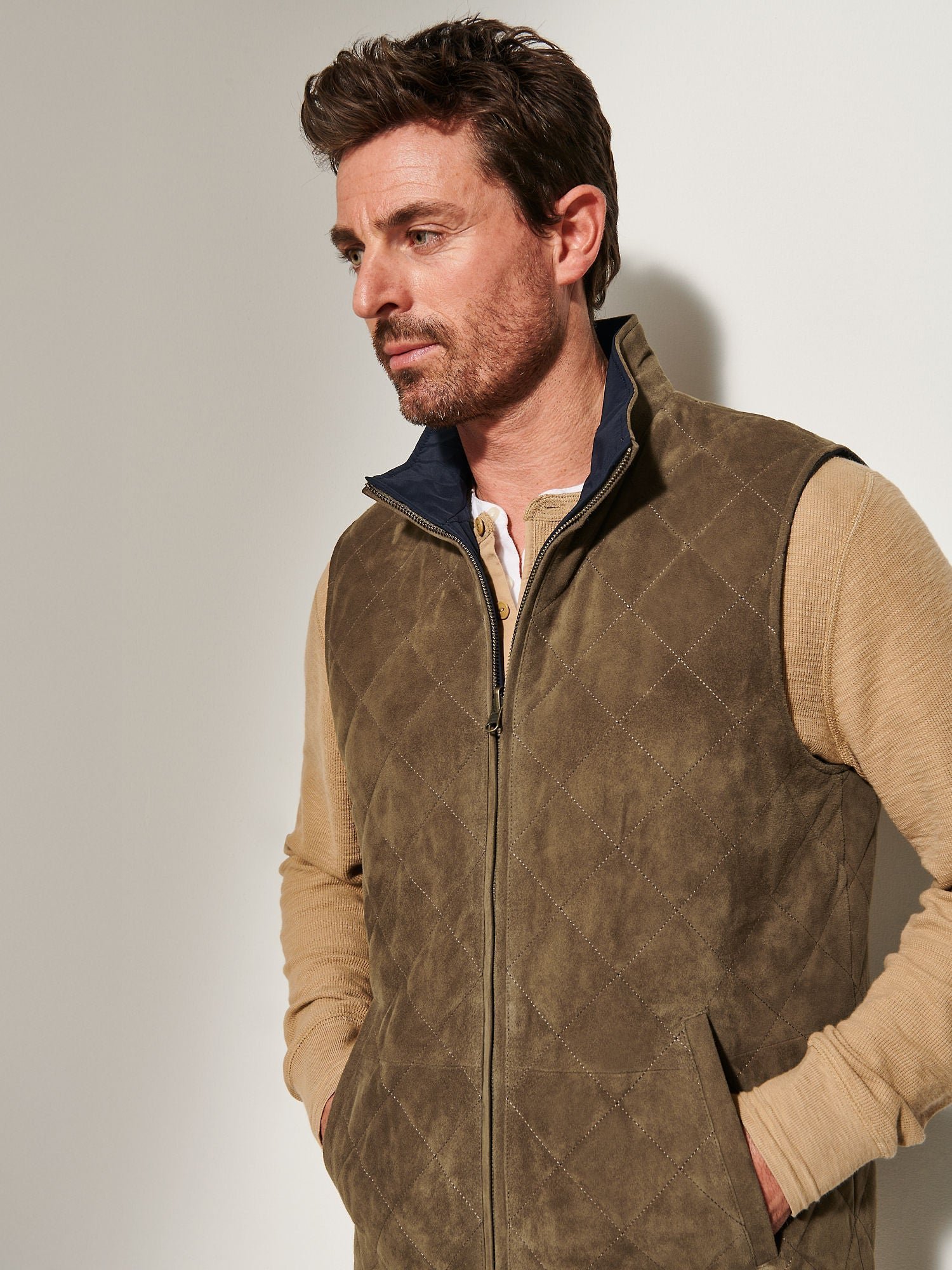 Whether you’re surveying your future home site or relaxing in the backyard on a chilly evening, the Cole reversible vest offers lightweight warmth and timeless style. On one side, diamond-quilted goat suede offers rugged appeal, while the horizontally quilted microfiber reverse side lends water resistance and casual style. Either way you wear this durable vest, you’ll have a full zip-front closure and two slip pockets.