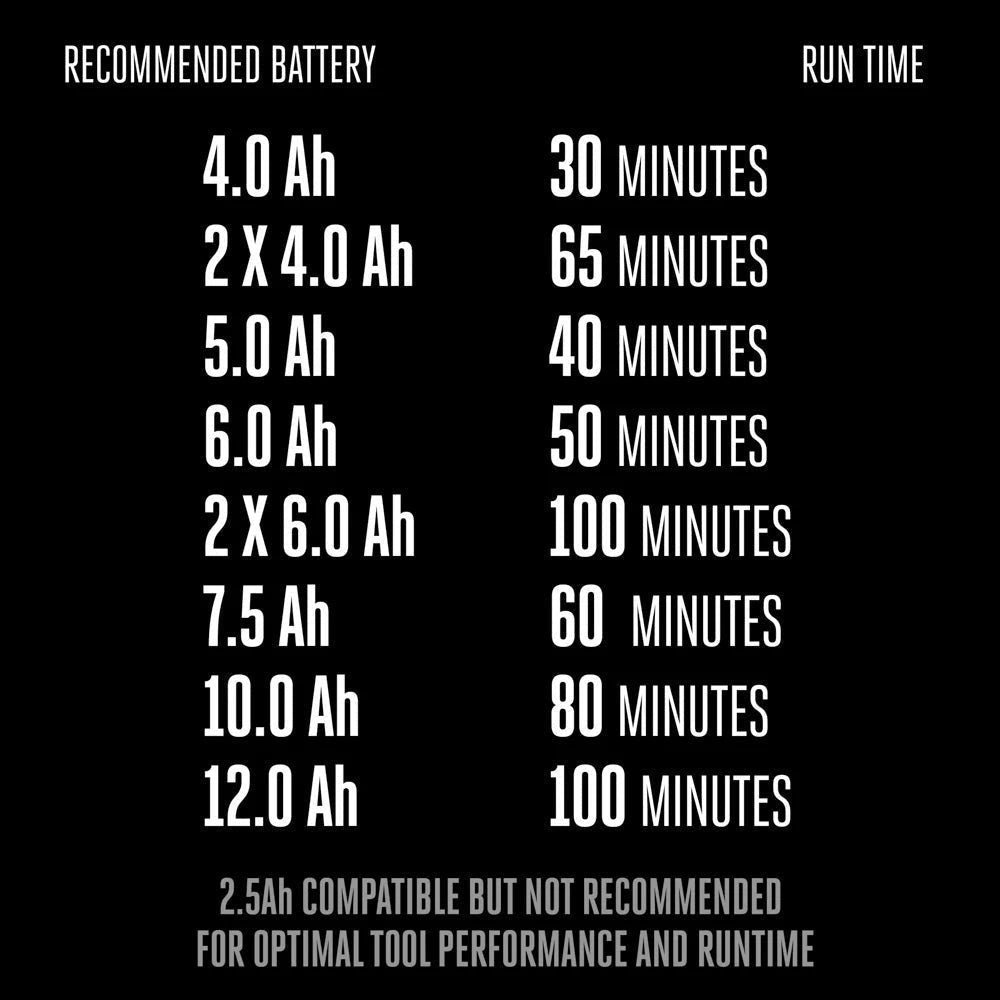 - Approximately 60-minute charging time with the recommended 7.5Ah ARC Lithiumâ„¢ battery and POWER+ Rapid Charger