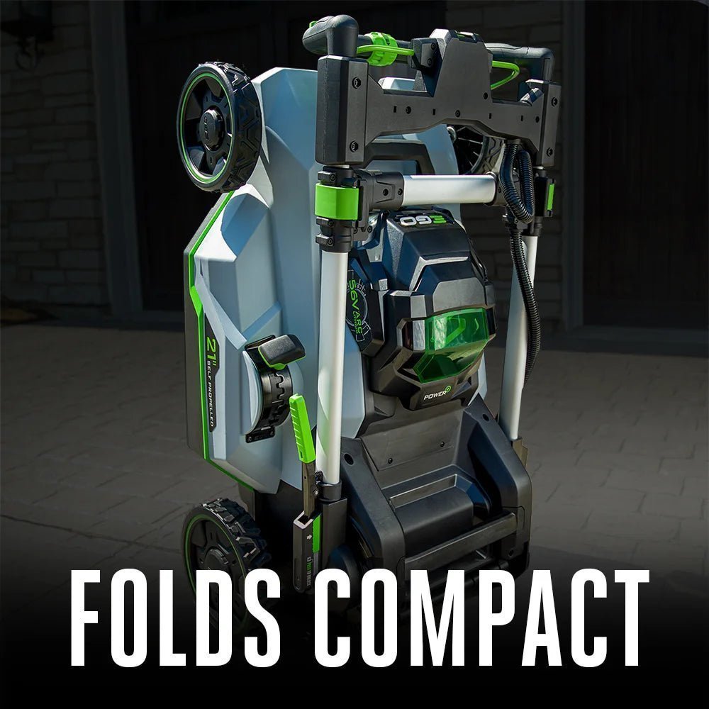 Three-in-one functionality delivers your choice of mulching, side discharge, or bagging your grass clippings; an easy-access two-bushel grass collection bag is included. This electric lawn mower includes bright LED lights for added visibility when mowing at dawn or dusk, and it folds for compact storage between cuts. Experience Power Beyond Belief™ with the EGO POWER+ 21″ Select Cut™ Self-Propelled Lawn Mower.