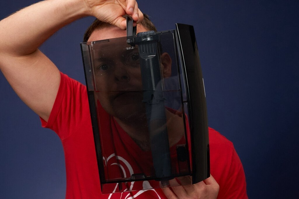 64 oz. water tank can be removed from the front of the machine