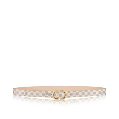Stylish and feminine, the Mini belt features a scaled-down version of Louis Vuitton’s summery Damier Azur canvas, which is perfectly complemented by the slender gold metal buckle with a symmetrical curve design.