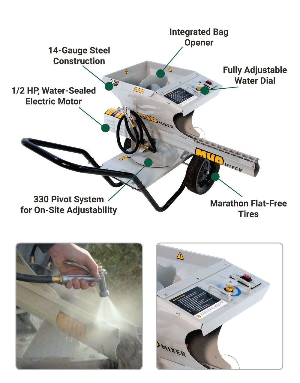 The Mud Mixer Cement Concrete Mixer is one of the fastest, easiest, multi-use mixers on the market. It features a fully-adjustable water input designed to be used with concrete, mortar or stucco mix. It quickly and effortlessly provides reliable consistency wherever it’s needed. Mixing mud has never been this quick, easy or clean.