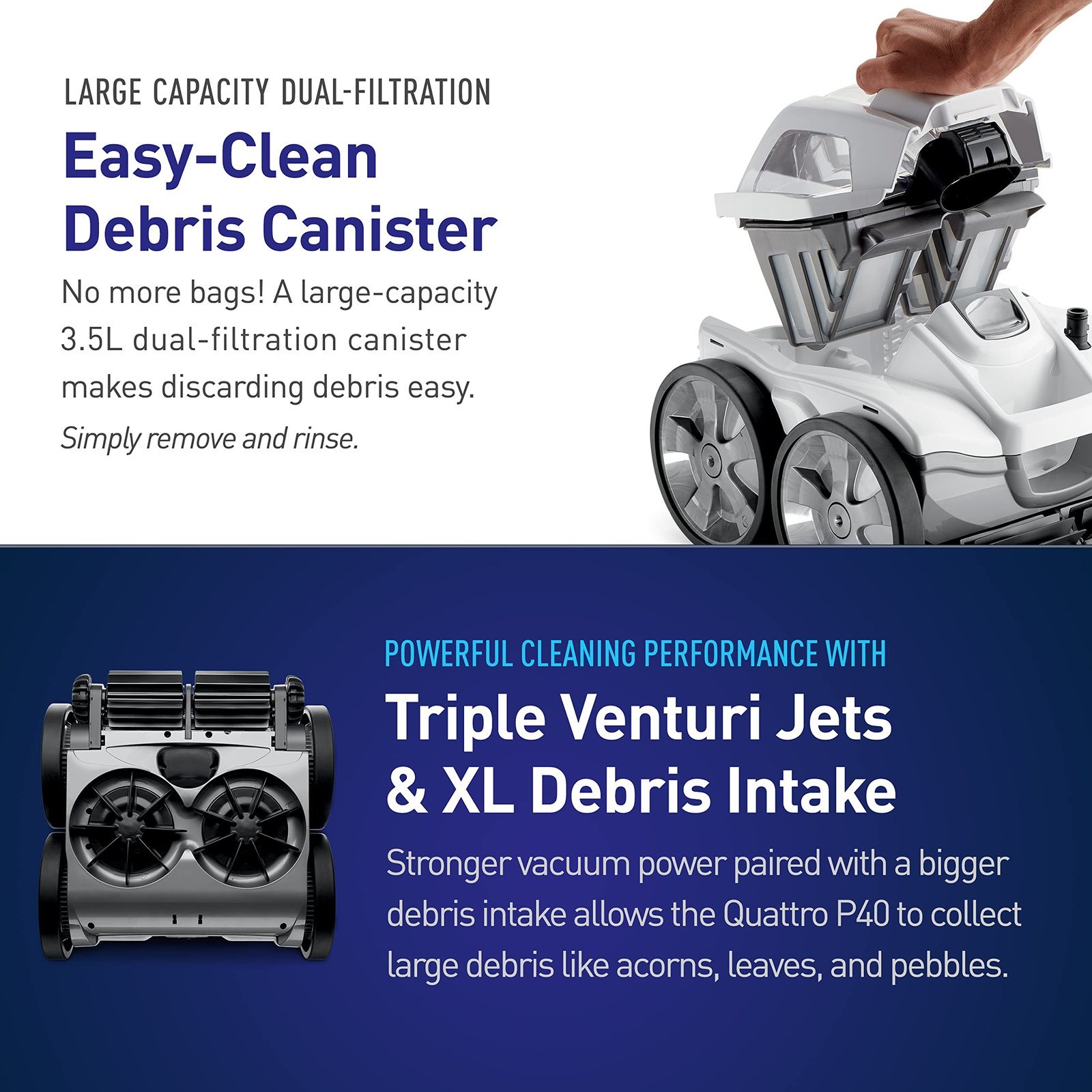 - Extra-Large Debris Intake & Strong Vacuum Power: Three powerful, venturi jet vacuums paired with an extra-large debris intake allows the Quattro P40 to collect large debris like acorns, leaves, and pebbles.