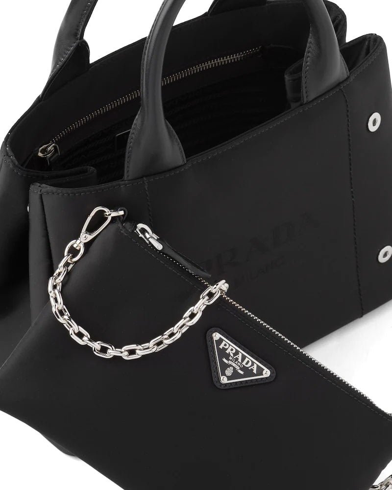 This tote made of iconic Prada nylon has a geometric shape. The bag, illuminated by the metal hardware, has a detachable shoulder strap and a removable pouch with chain handle. It is decorated with the enameled metal triangle logo on the pouch and the jacquard logo on the front.