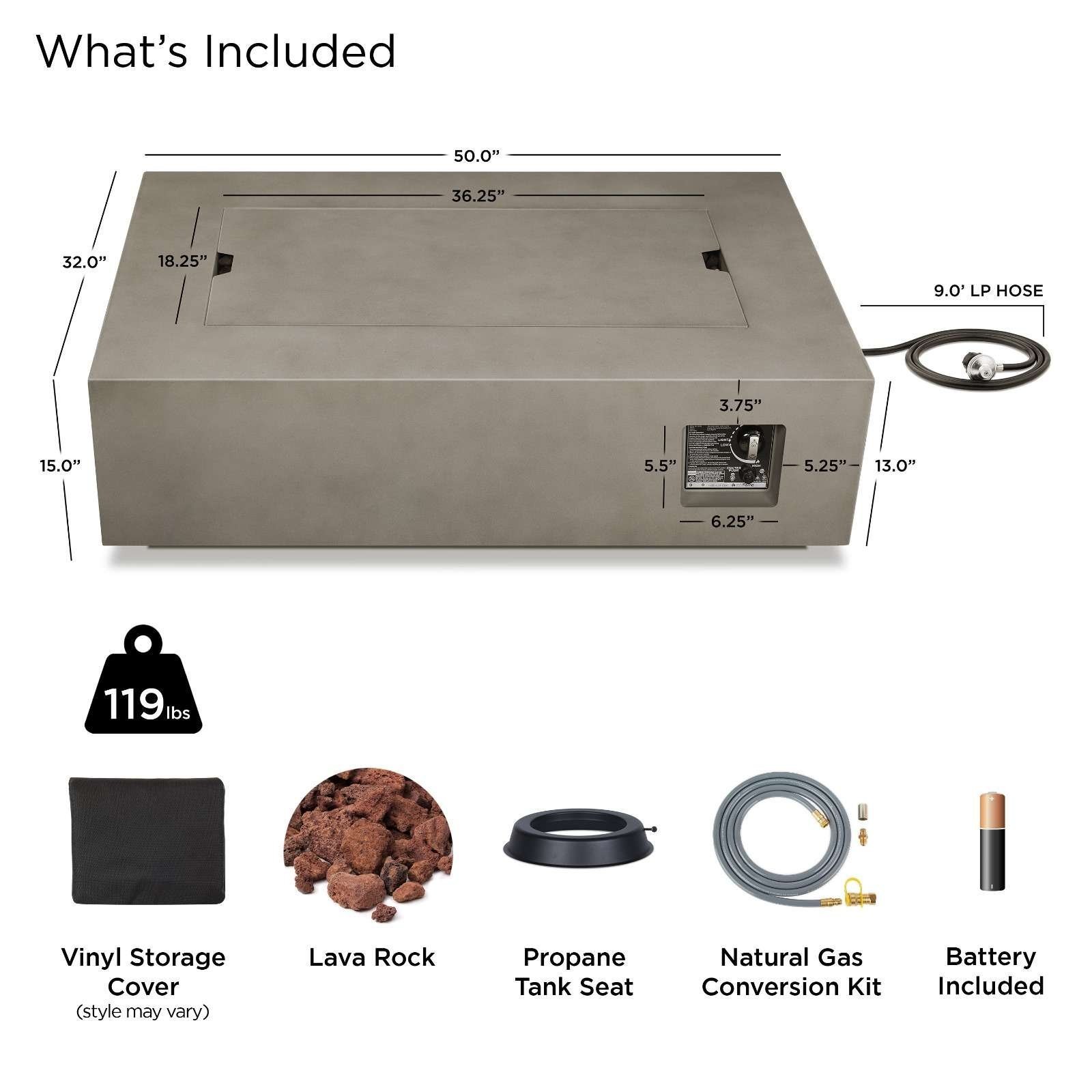 Fire table: 50″L x 32″W x 15″H; 119 lbs