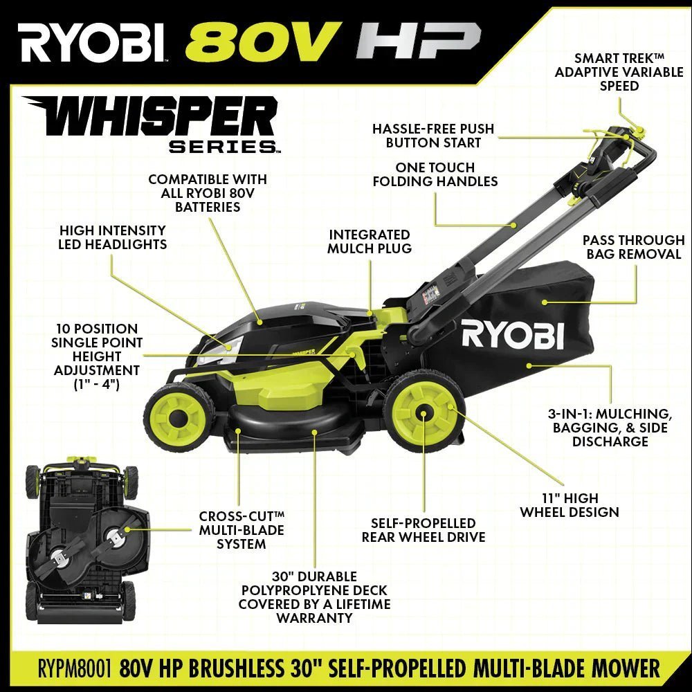 The RYOBI 80V HP Brushless 30” Self-Propelled Multi-Blade Mower delivers more power than a 223cc gas mower, making it a true gas replacement. Easily tackle up to 1 acre with up to 90 minutes of runtime per charge. Experience the industry’s best 3-in-1 cutting performance with the CROSS CUT™ Multi-Blade System. This allows for less clumping when mulching, further & more even dispersal when side discharging, and when bagging the fine clippings fill from back to front to maximize space for less bag changes. Two premium brushless motors and advanced electronics automatically react to mowing conditions by increasing the blade speed to eliminate bogging down and powering through the toughest cut. As part of the WHISPER SERIES™, this mower is engineered to be 70% quieter than gas, making it perfect for areas with noise restrictions. SMART TREK™ self-propelled technology allows you to easily adapt the mower’s speed to your pace for less fatigue. Choose between 1”-4” cutting height with a 10-position single point height adjustment. When the job is done, the handles quickly and easily collapse for compact, vertical storage. Fully recharge your 80V 10Ah battery with the included 80V Hyper Charger in 1 hour or less. The durable deck is lightweight, resists corrosion, and is covered by limited lifetime warranty. The RYOBI 80V HP Brushless 30” Mower is proudly made in the USA with global materials & is backed by a 5-year tool & battery warranty.