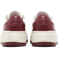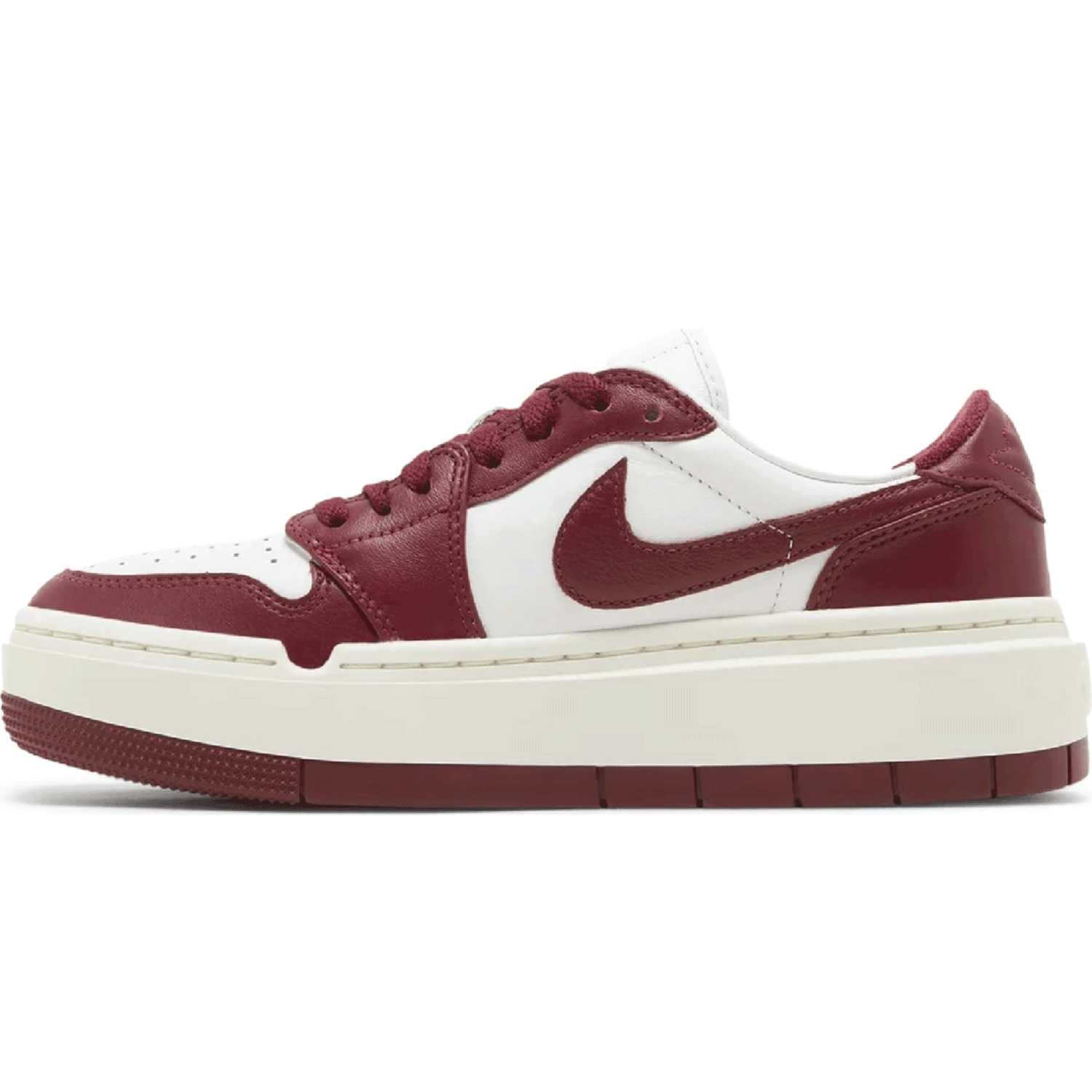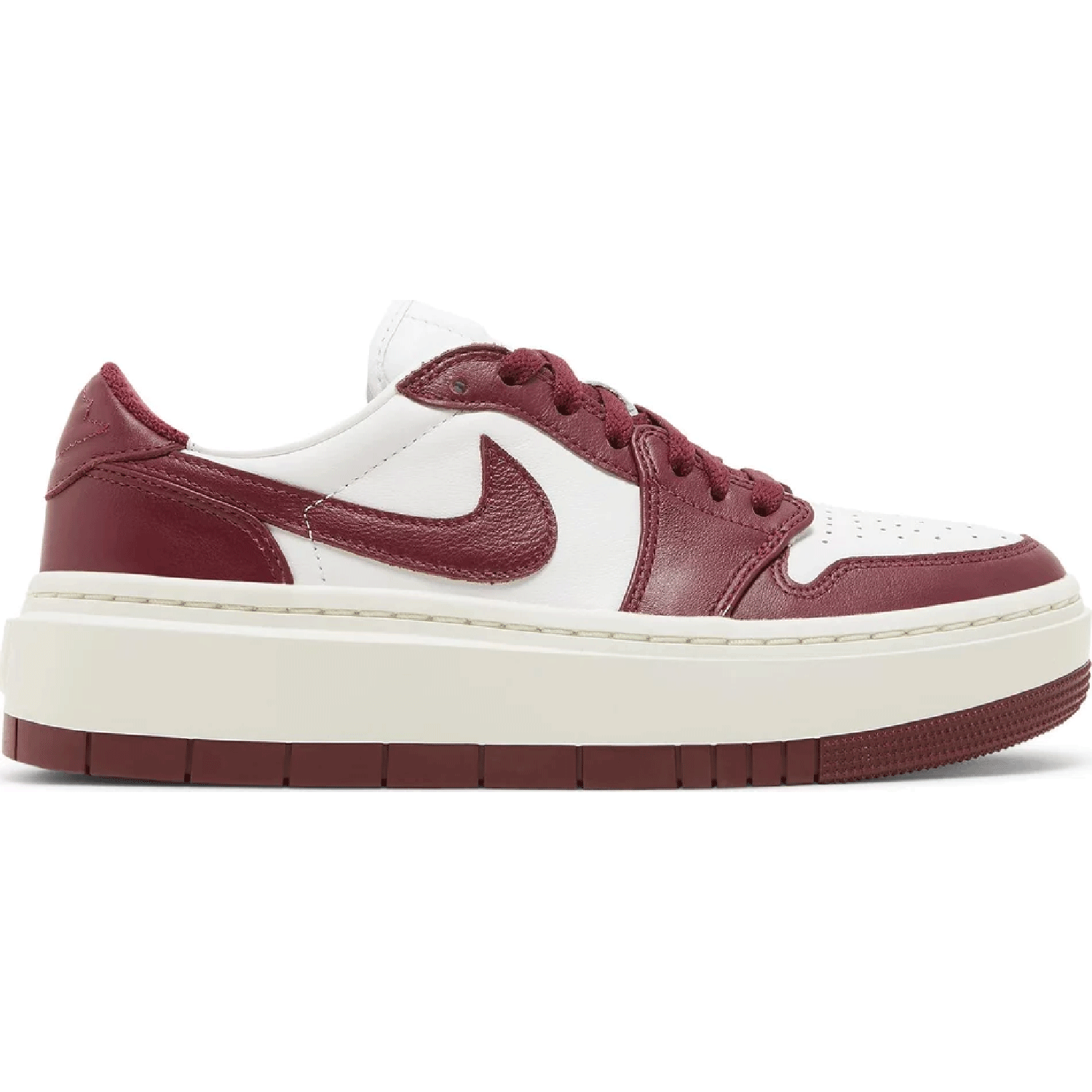 The Air Jordan 1 Elevate Low ‘Dark Beetroot’ brings fashion-forward style to the sneaker that started it all. The low-top is dressed in a white leather upper with contrasting maroon overlays and a color-matched Swoosh. The outline of a Wings logo is stitched on the heel tab, while Nike Air branding is stamped on the cork insole. The sneaker is mounted on an off-white platform midsole, marked with a Jumpman logo at the rear and supported by durable rubber around the perimeter of the outsole.