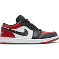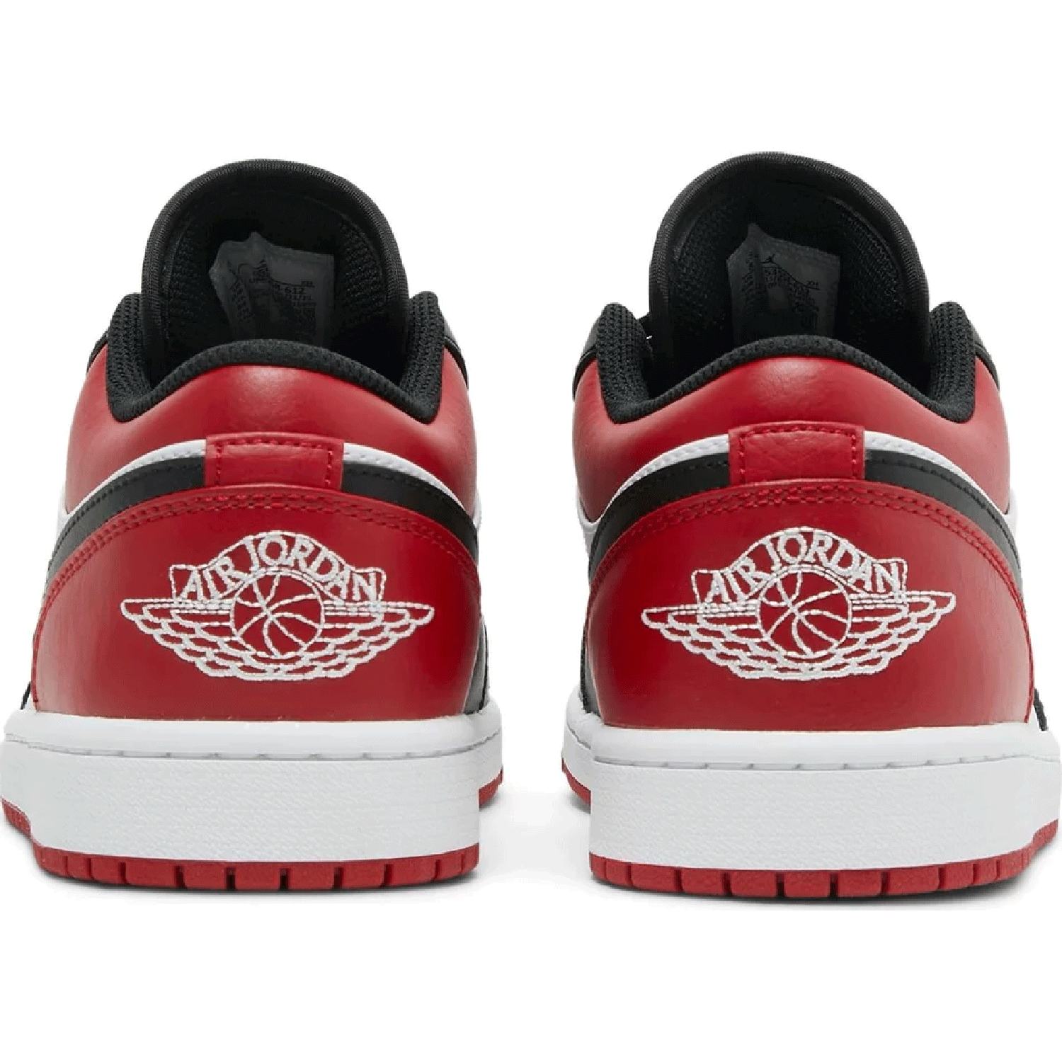 The Air Jordan 1 Low ‘Bred Toe’ showcases distinctive color blocking originally featured on an AJ1 High release from 2018. The low-top carries an all-leather upper that combines white quarter panels, a black forefoot overlay, a crimson toe box, and a matching red finish on the collar and heel overlay. The latter is marked with a stitched Wings logo, while the black nylon tongue displays white embroidered Jumpman branding. The sneaker is underpinned by a durable rubber cupsole, which pairs crisp white sidewalls with a red rubber outsole.
