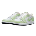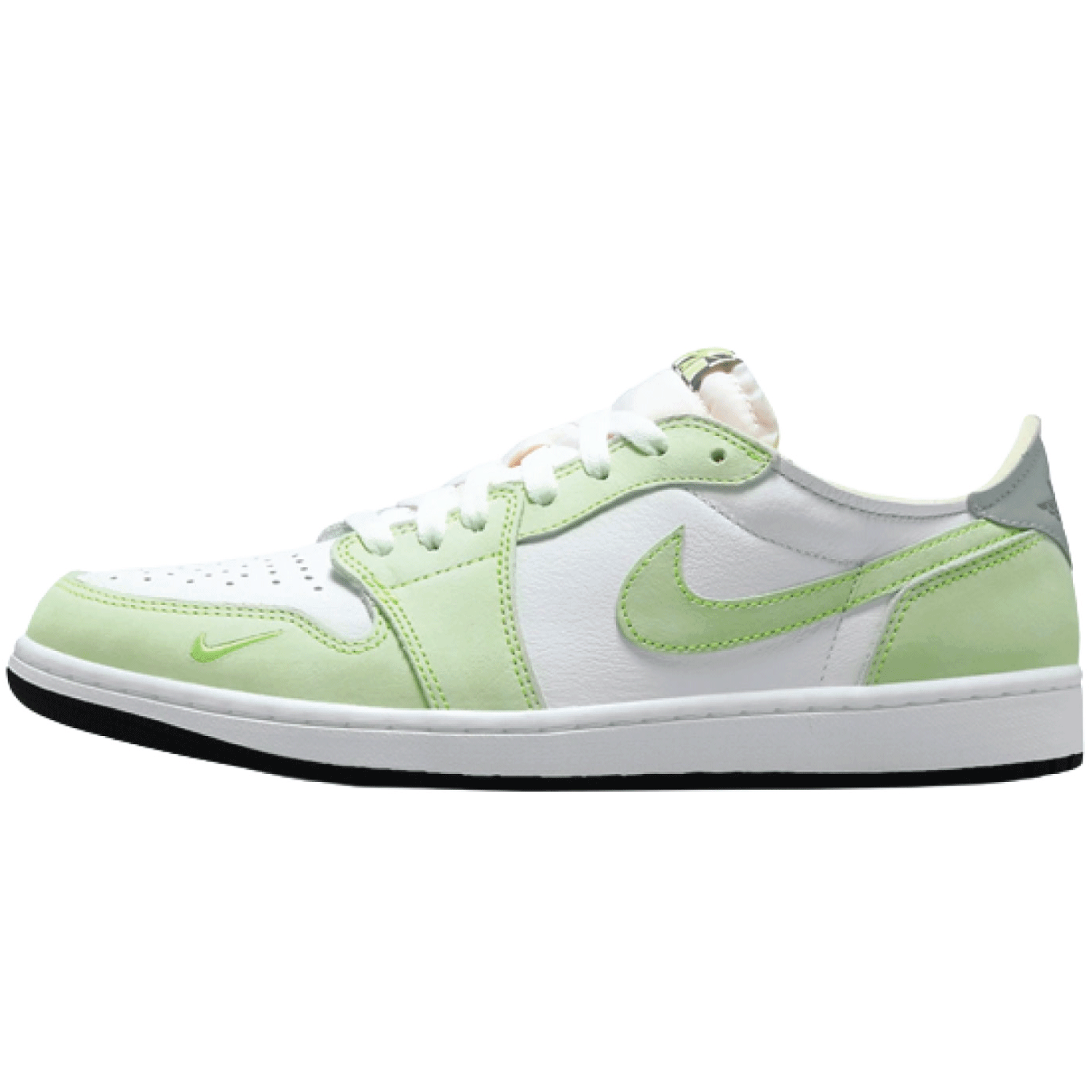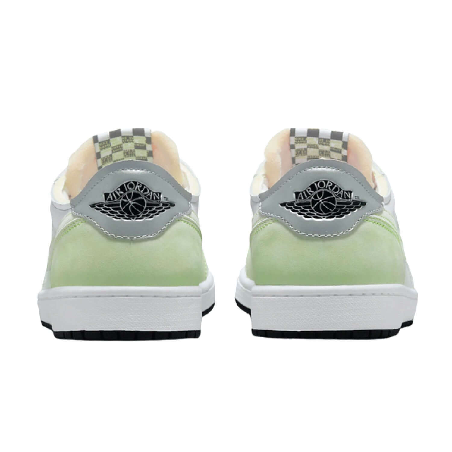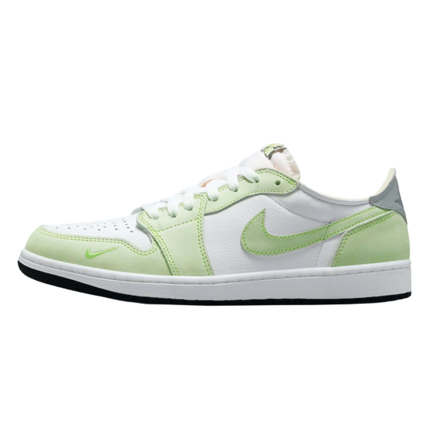 The Air Jordan 1 Low OG 'Ghost Green' treats the classic silhouette to a pastel-colored refresh. The low-top is dressed in a white leather upper with pale green synthetic suede overlays and a metallic silver heel tab marked with a Jordan Wings logo. A tonal mini-Swoosh is embroidered on the lateral forefoot, while a checkerboard Nike tag adorns the exposed-foam nylon tongue. The sneaker’s low-cut collar is similarly lined in visible foam, giving the shoe a unique DIY aesthetic.