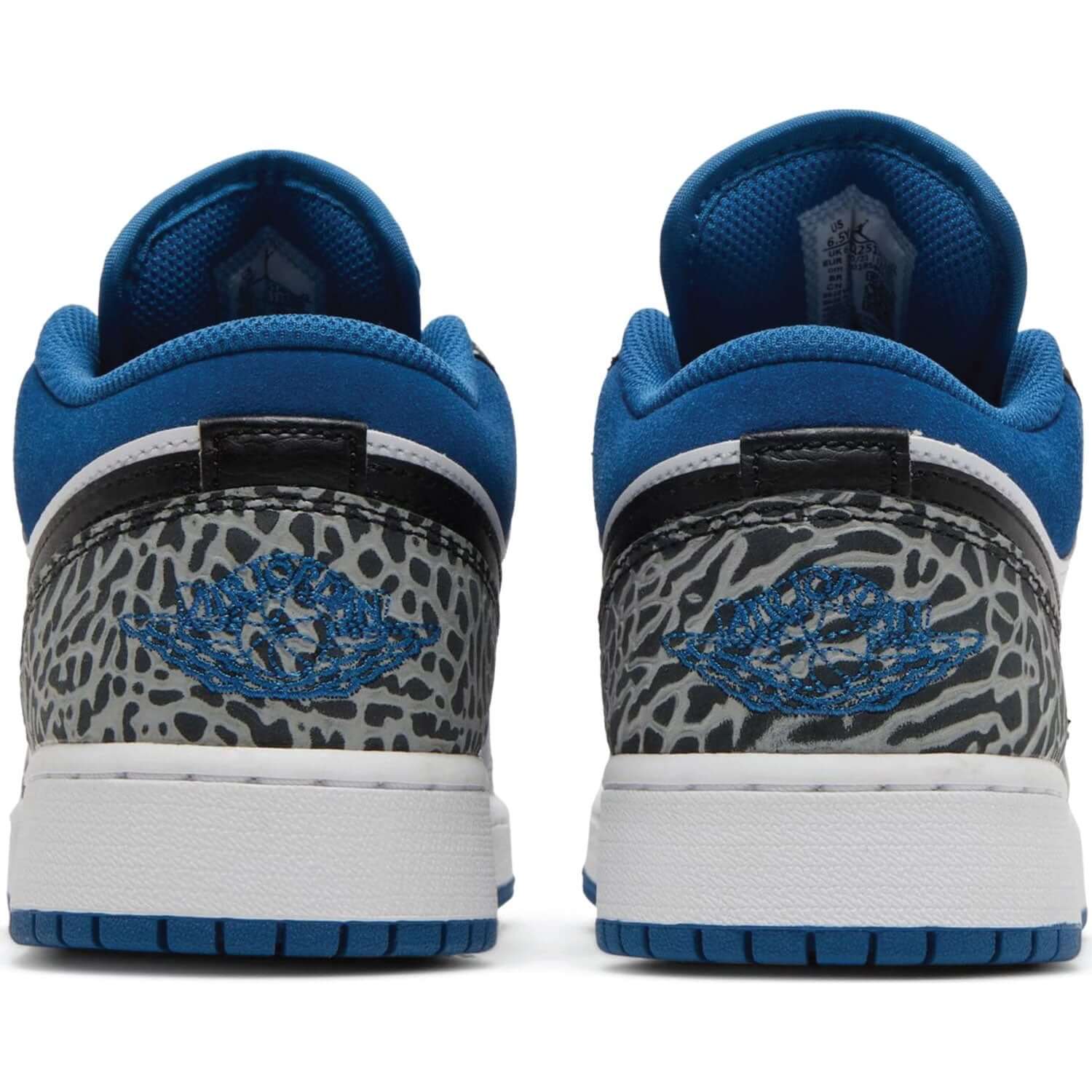 Made for big kids, the Air Jordan 1 Low SE GS ‘True Blue’ borrows a design page from the Air Jordan 3. The white leather upper is accented with a black Swoosh and dark grey elephant print on the eyestay and heel overlay, marked with a Wings logo in blue embroidery. A subtle lizard texture is applied to a forefoot overlay in light grey leather, while the suede collar is finished in Dark Marina Blue. The latter hue is repeated on the Jumpman logo that adorns the tongue. Underpinning the sneaker is a durable rubber cupsole, highlighted by white sidewalls and a grippy blue rubber outsole.