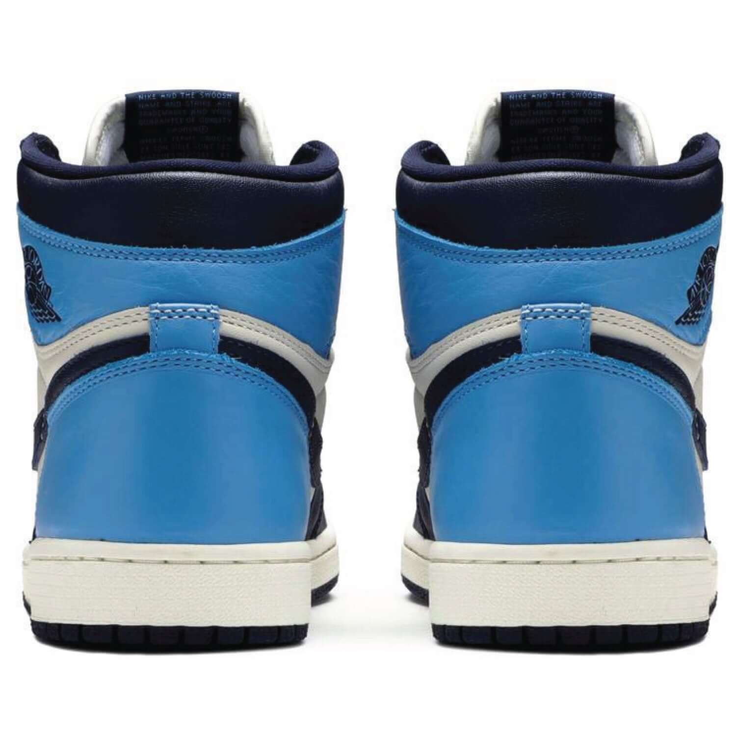 The Air Jordan 1 High OG Obsidian UNC is a stylish and modern take on the classic Jordan 1 silhouette. The shoe features a combination of white, dark blue, and light blue leather on the upper, with the dark blue colorway taking up most of the shoe. The Nike Swoosh, collar, and toe box are white, while the tongue and heel tab are light blue with white Nike and Jordan branding. The shoe sits atop a white midsole with a blue outsole. It's a comfortable and fashionable sneaker that can be worn for both casual and athletic occasions.