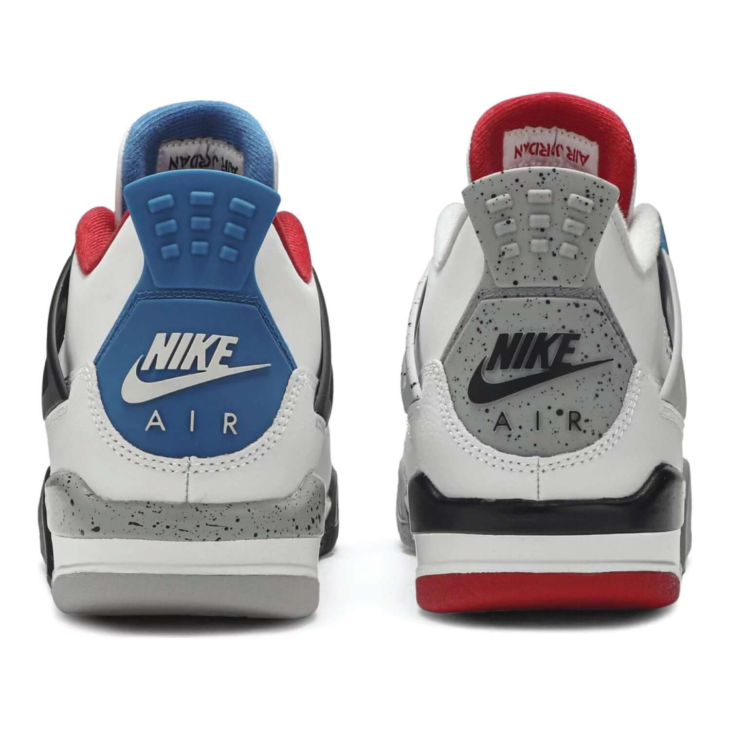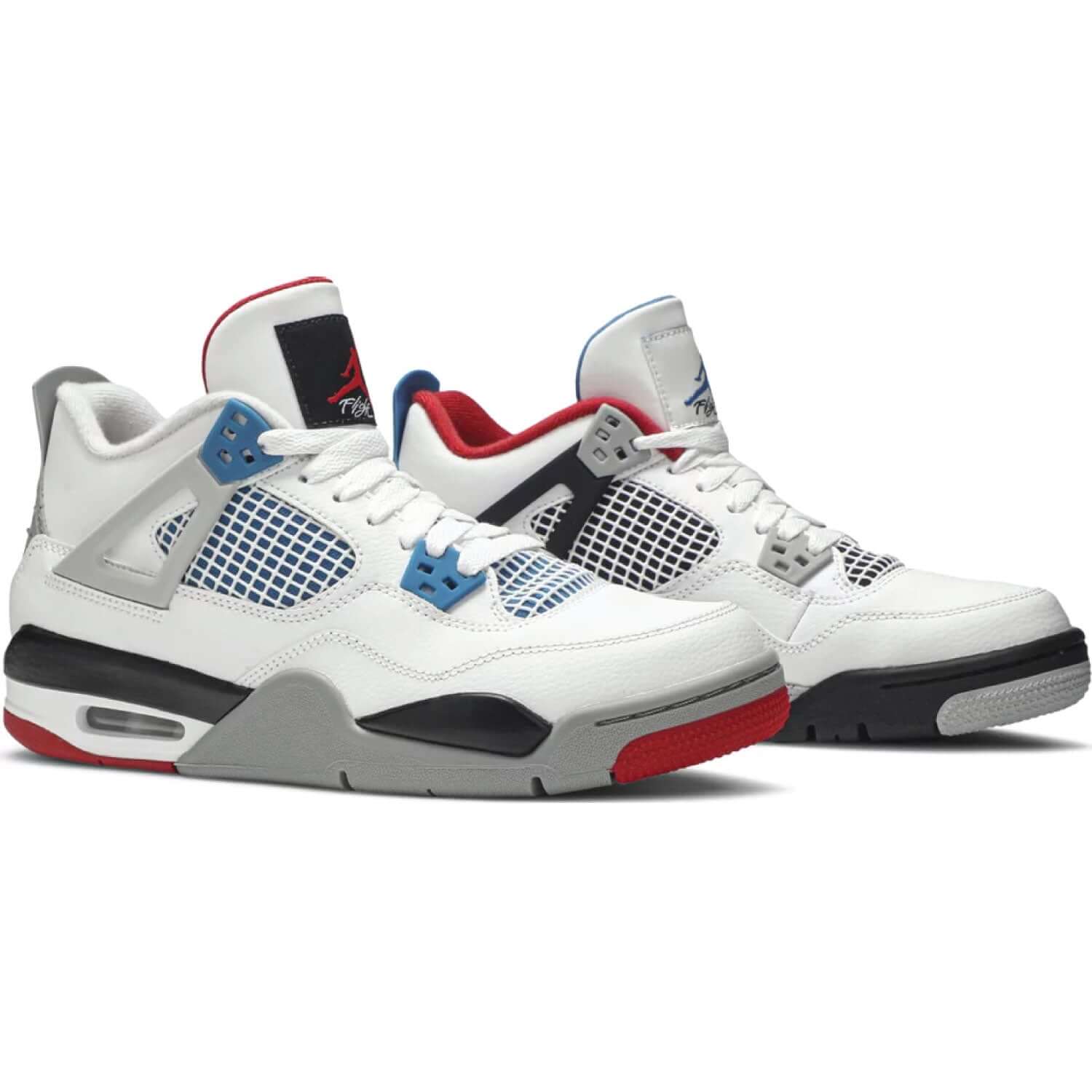 The Air Jordan 4 Retro SE GS 'What The 4' is a unique and colorful sneaker. The design features a mismatched upper with a combination of different colors, patterns, and materials from previous Air Jordan 4 releases. The left shoe has a blue and black denim upper with a red Jump Man logo on the tongue and a cement print on the midsole. The right shoe has a red and black suede upper with a blue Jumpman logo on the tongue and a splatter print on the midsole. Both shoes have a white midsole with a black outsole. The sneaker also comes with interchangeable tongue patches in different colors and designs.
