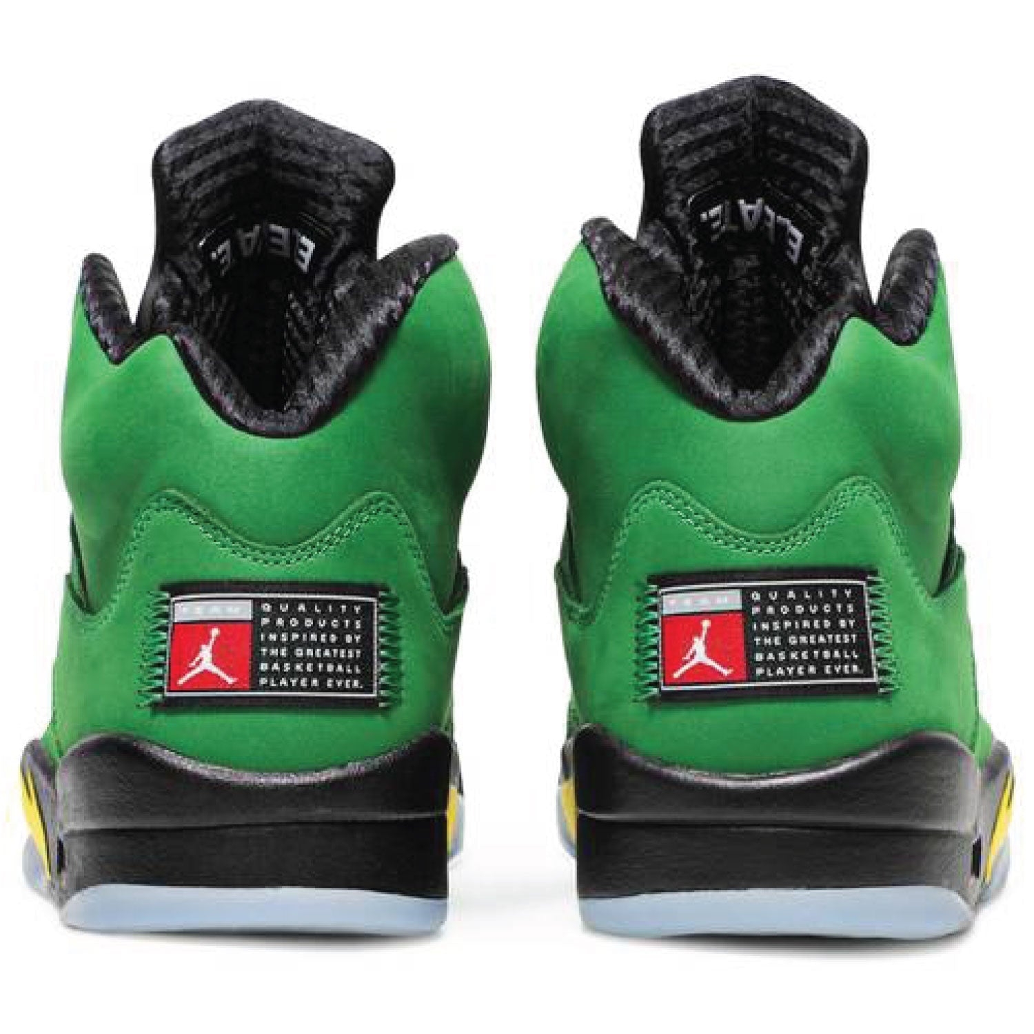 - The Air Jordan 5 Retro 'Oregon Ducks' features a black nubuck upper and white midsole with speckled 'Oregon Ducks' shark teeth. Released in November of 2013 to celebrate the silhouette’s 23rd anniversary, the design also includes an anthracite tongue, a ‘23’ embroidered on the lateral side of the upper near the heel, and an ice blue translucent outsole
