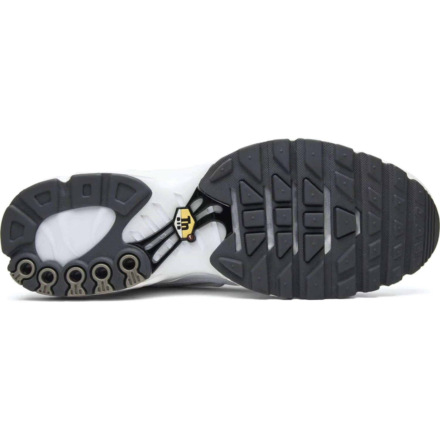 The 1998 brainchild of Sean McDowell, Air Max Plus sneaker was the brand's first sneaker to feature its innovative Tuned Air technology. This 'White' iteration features a technical mesh upper, synthetic injections of iconic TPU ribbing, a synthetic toe guard and tonal branding. Black verticals are visible in the forefront and heel Air units, while three tread patterns provide stability to the rubber outsole.