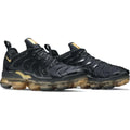 The Nike Air VaporMax Plus ‘Black Gold’ showcases a two-tone color scheme on a hybrid silhouette imbued with a maximalist aesthetic. An Air Max Plus upper, constructed from black stretch textile with a tonal TPU cage, rides on a foam midsole supported by Nike’s revolutionary VaporMax platform. The plush cushioning system is tinted in a metallic gold hue, matching the TPU midfoot shank and branding hits up top.
