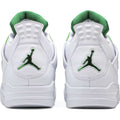 The Jordan 4 Retro Metallic Green is a pair of shoes that was released in 2020. The shoes feature a white leather upper with metallic green accents on the eyelets, Jumpman logo, and heel tab. The shoes also feature a green outsole that complements the metallic green tone nicely. The Jordan Metallic Green has a classic design that is stylish and comfortable. The shoes have a padded tongue and collar that provide extra cushioning and support. The air sole unit in the heel of the shoe provides excellent shock absorption and makes the shoe ideal for sports and other physical activities.