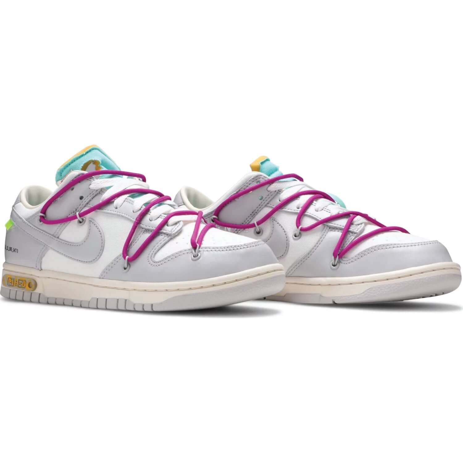 2019. The low-top makes use of a white leather upper with soft grey canvas overlays, along with Virgil Abloh’s calling card flourishes, which include a plastic zip tie and printed Helvetica text. Contrasting pops of color arrive via the sneaker’s secondary lacing system, zip-tie, an exposed-foam tongue and a rectangular tab affixed to the Swoosh. Limited to fifty pairs, a ’21 of 50’ badge is affixed on the lateral midsole.