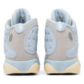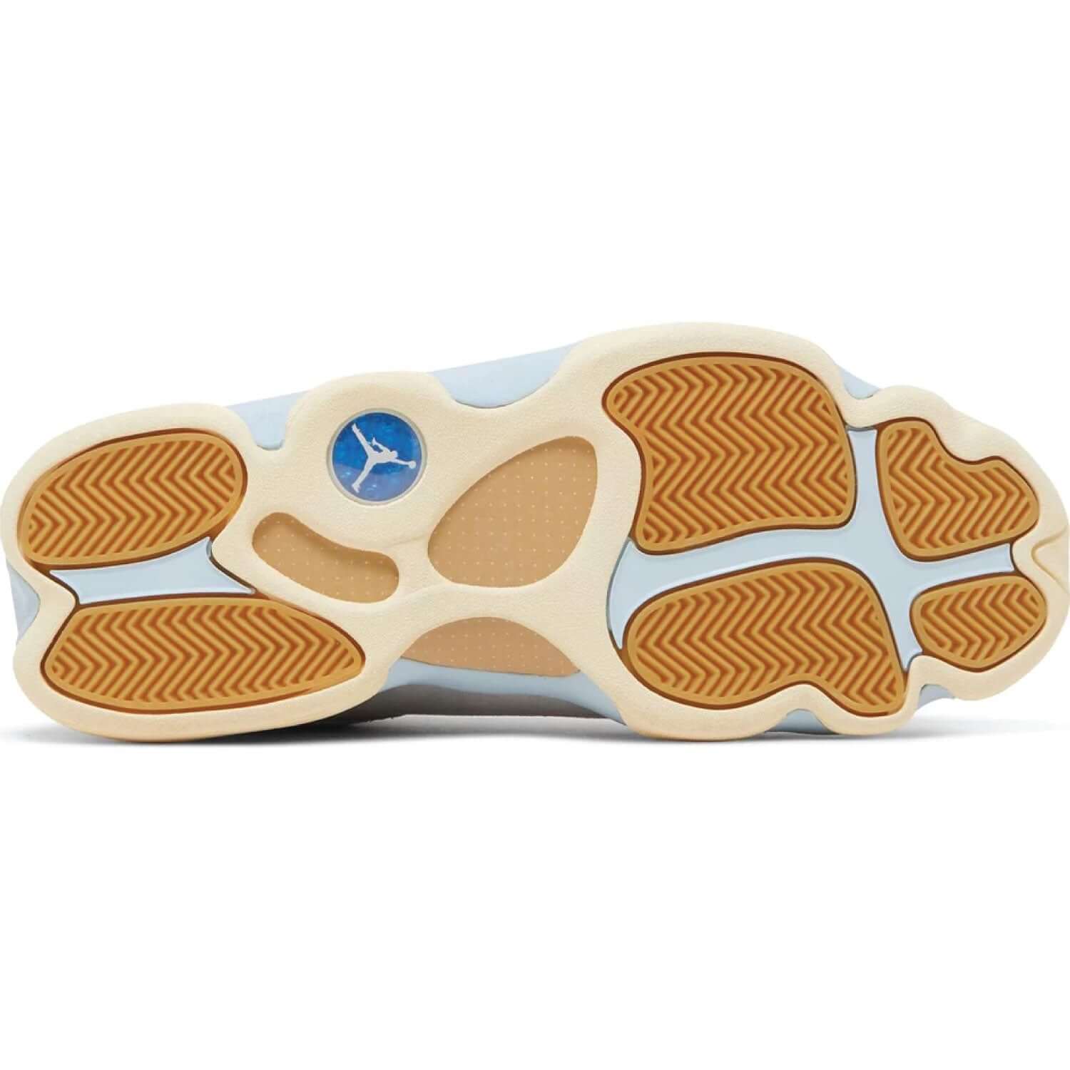 The SoleFly x Air Jordan 13 Retro 'I’d Rather Be Fishing' delivers the Miami retailer’s pastel-hued rendition of the legacy silhouette. The upper combines cream-colored ripstop textile with grey suede paneling and dimpled suede overlays in a powder blue finish. In addition to the 13’s signature holographic cat eye, branding elements include mismatched Jumpman and SoleFly insignias on each tongue and elephant-print sockliner. Underfoot, the panther paw outsole features a carbon fiber shank plate and herringbone traction pods in grippy gum rubber.