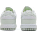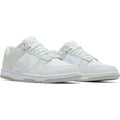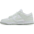 The women’s Dunk Low Next Nature 'White Mint' combines a pastel two-tone palette with a sustainable build made with at least 20% recycled materials by weight. The synthetic leather upper features a pristine white base with lightly textured forefoot and heel overlays in a pale mint green hue. Standard branding lands on the woven tongue tag and leather heel tab, while the Volt-colored mesh sockliner is stamped with retro pinwheel logo.